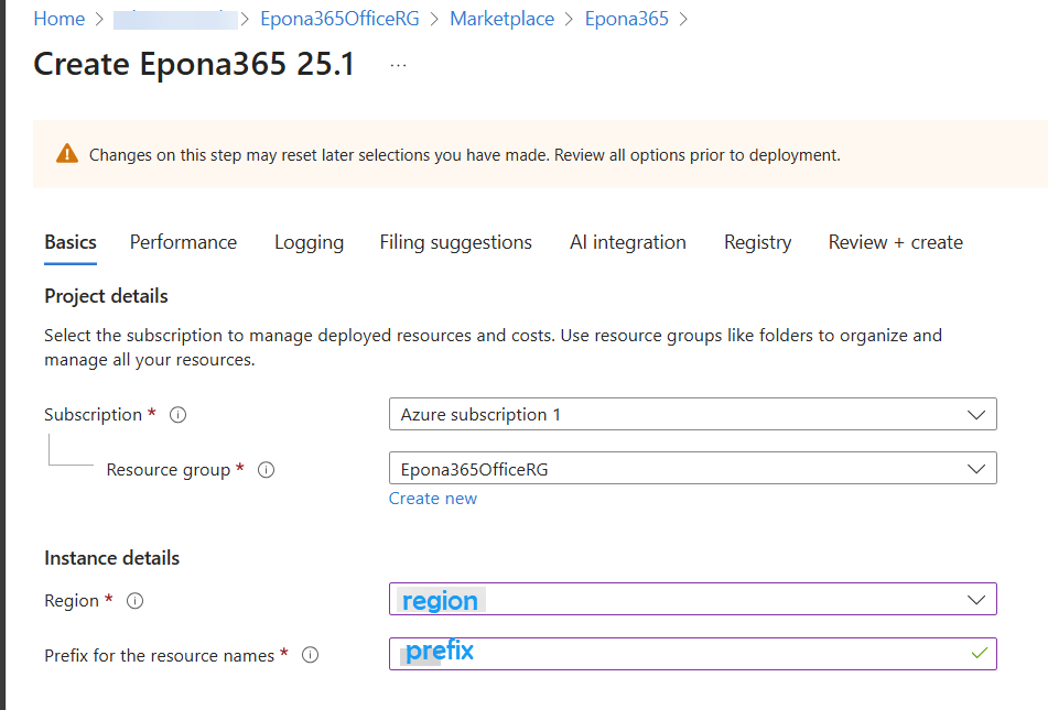 Select the Subscription and Resource group, select the Region (preferable identical to the Azure Subscription region) and enter the Prefix for the resource names. This prefix is placed before the names of the resources that are to be created, the prefix is limited to 3 to 5 characters and can only include lower case letters and number. The prefix needs to be globally unique, so do not use ep365, as we have probably already taken this prefix.