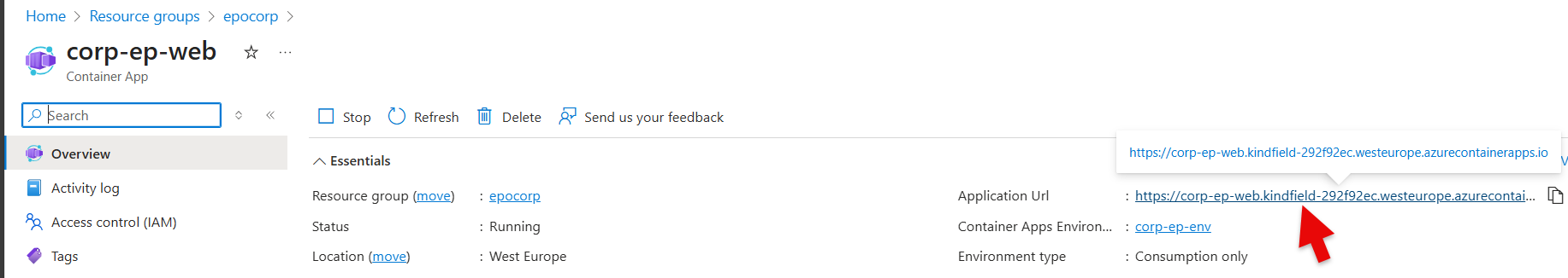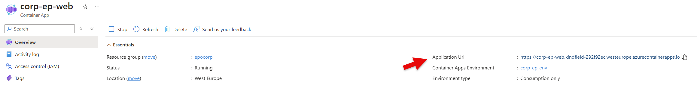 - Visit the {prefix}-ep-web container and lookup the Application (Ingress) URL on the right top corner