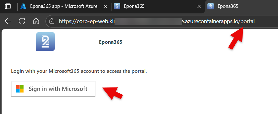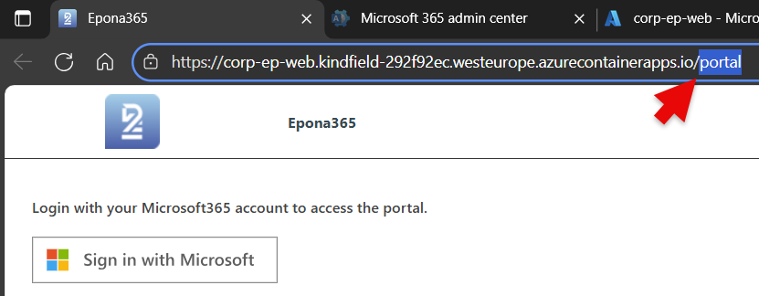 - Go to the {prefix}-ep-web container, click on the Application URL and sign into the /portal page