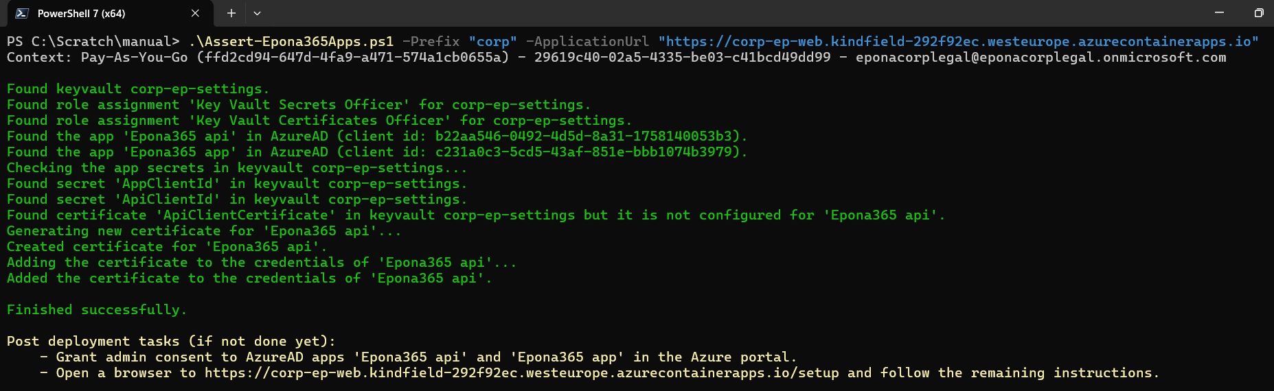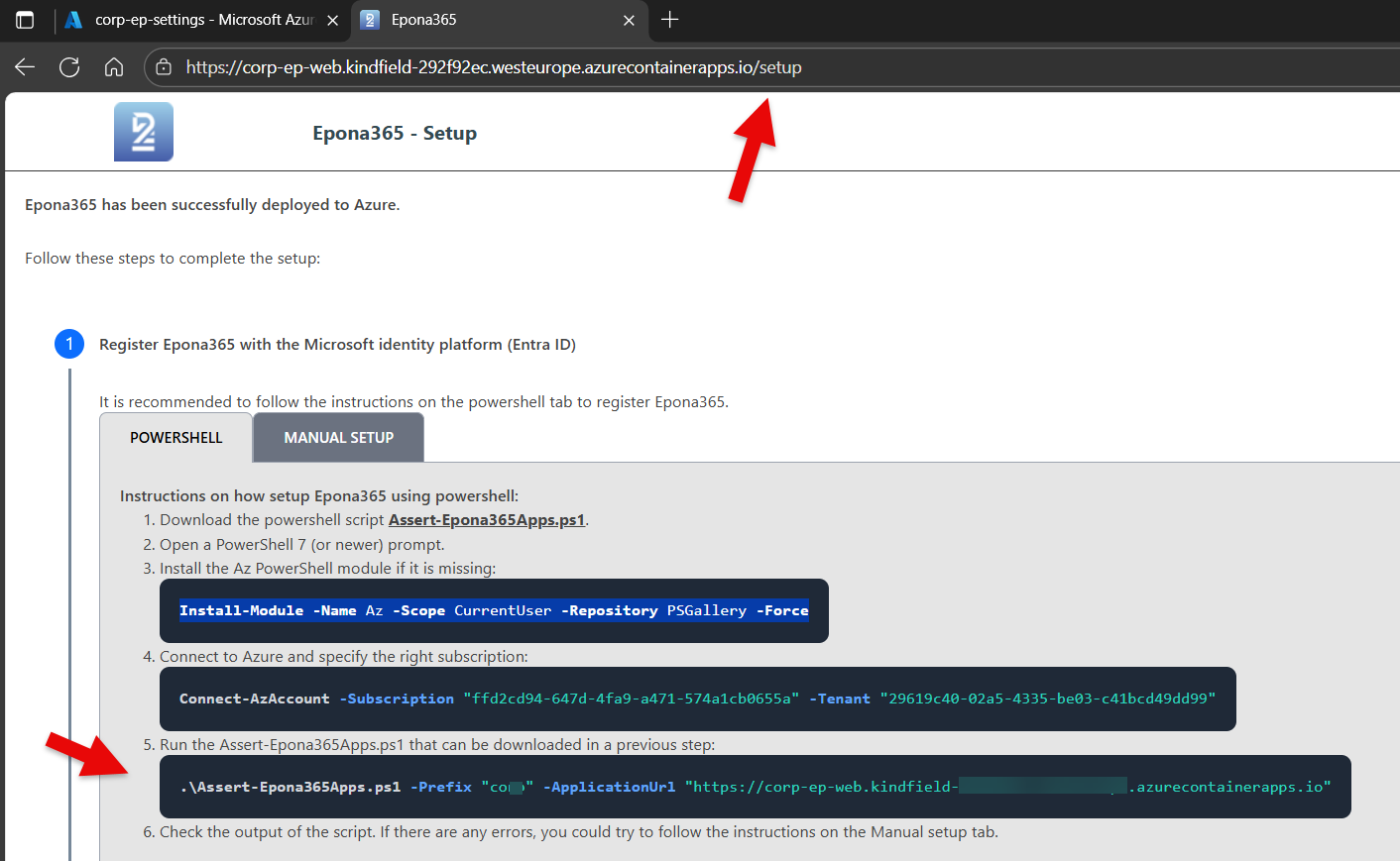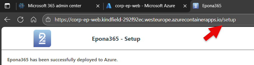 The deployment of the containers and other resources to the Epona365Office RG resource group in the Azure Subscription is finished, but the containers cannot reach Microsoft 365 resources such as SharePoint online or Graph unless an EntraID APP is created that provides the containers or the (delegated) users of the system access to these resources. This process of creating two APPs with the right permissions is complex, therefore a PowerShell script can be used to create the APPs and connect the APPs to the containers. If your organisation does not allow Powershell scripts to be run, then you can perform the manual steps outlined in the ep-web Container on the /setup page.