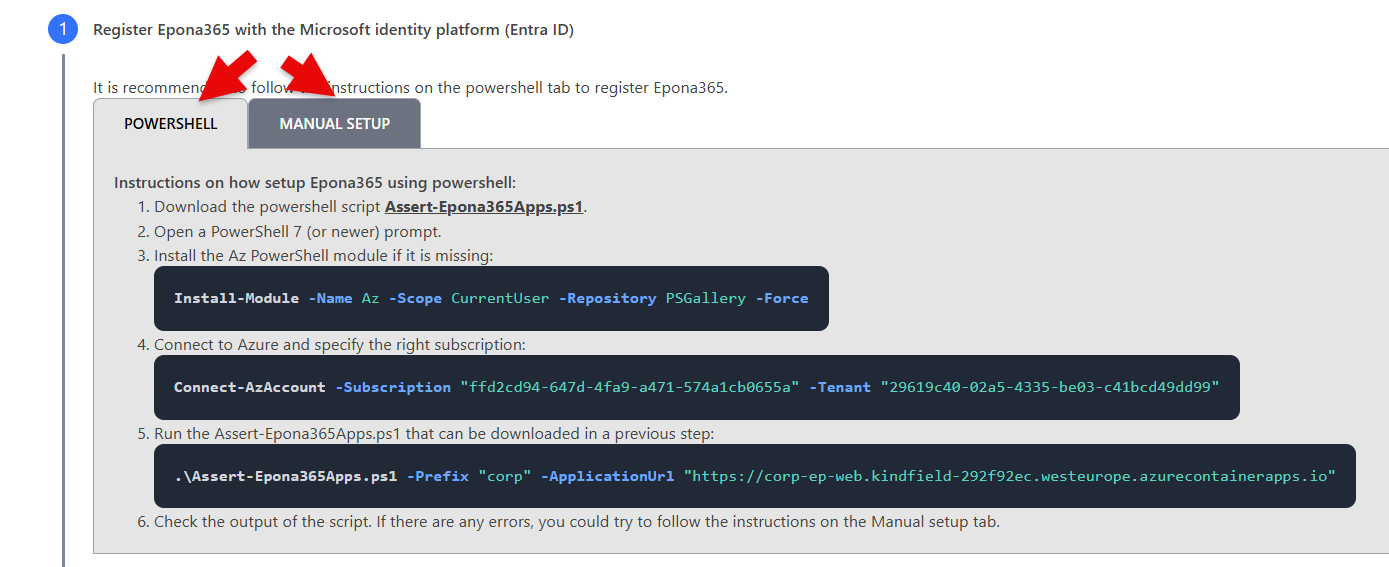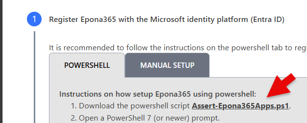 - Choose step 1: Register Epona365 with the Microsoft identity platform (Entra ID), two choices are presented, using Powershell to setup the two Entra ID APPs or Manual steps