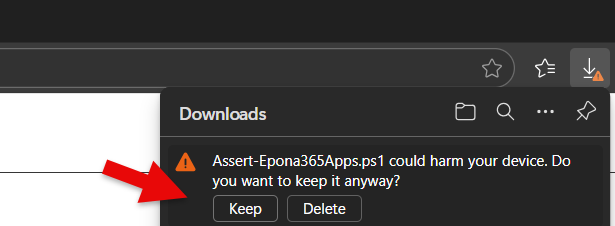 - The download of a script file is possibly blocked by the Browser, for Edge click Keep to save the file to the default download location