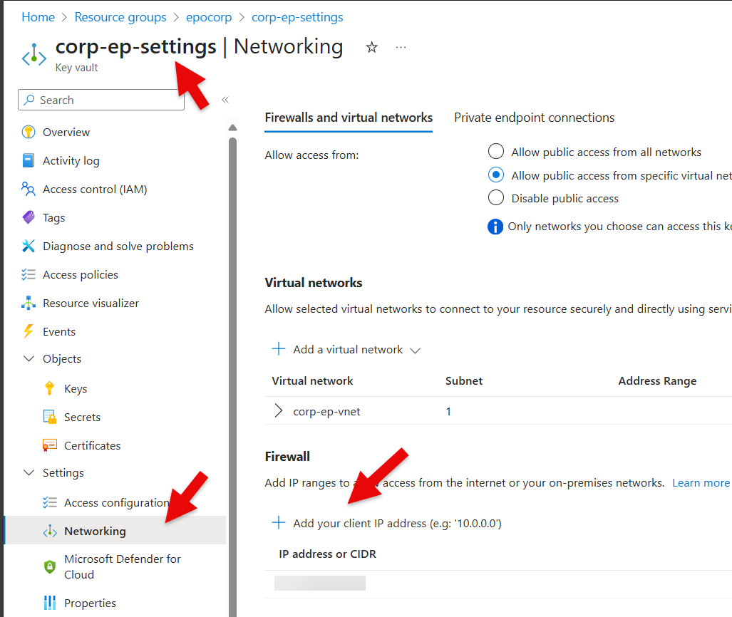 - Choose Objects, Networking and under the section Firewall, click Add your client IP address to allow your workstation to run Powershell against the Keyvault