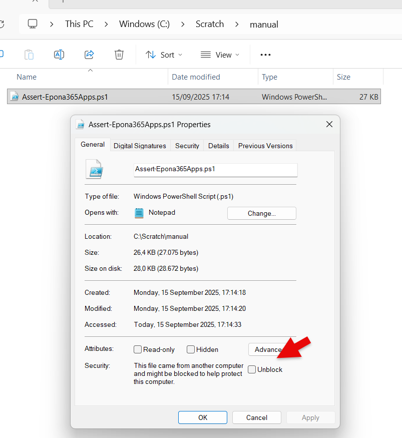 - Rightclick on the *.ps1 file and choose Properties, Unblock the file in it is blocked by the download from an Internet location. Move the PS1 file to a temporary location so that it is easier to reach than the Download folder which has spaces in the folder name.