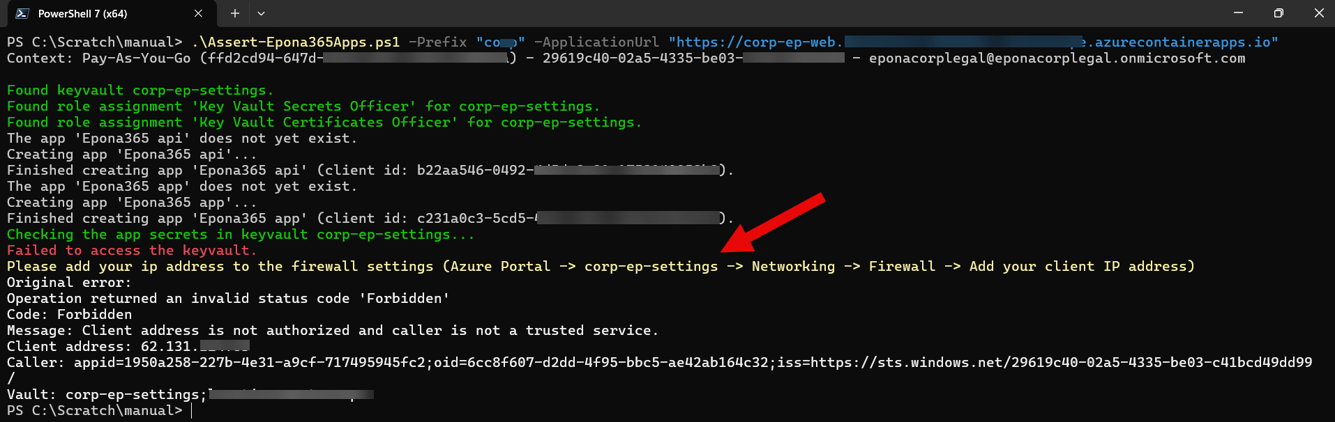 Remark: when you have now allowed the workstation running the Powershell script Firewall access to the Epona365 Office {prefix}-ep-settings, then you will see a firewall warning during the execution of the script