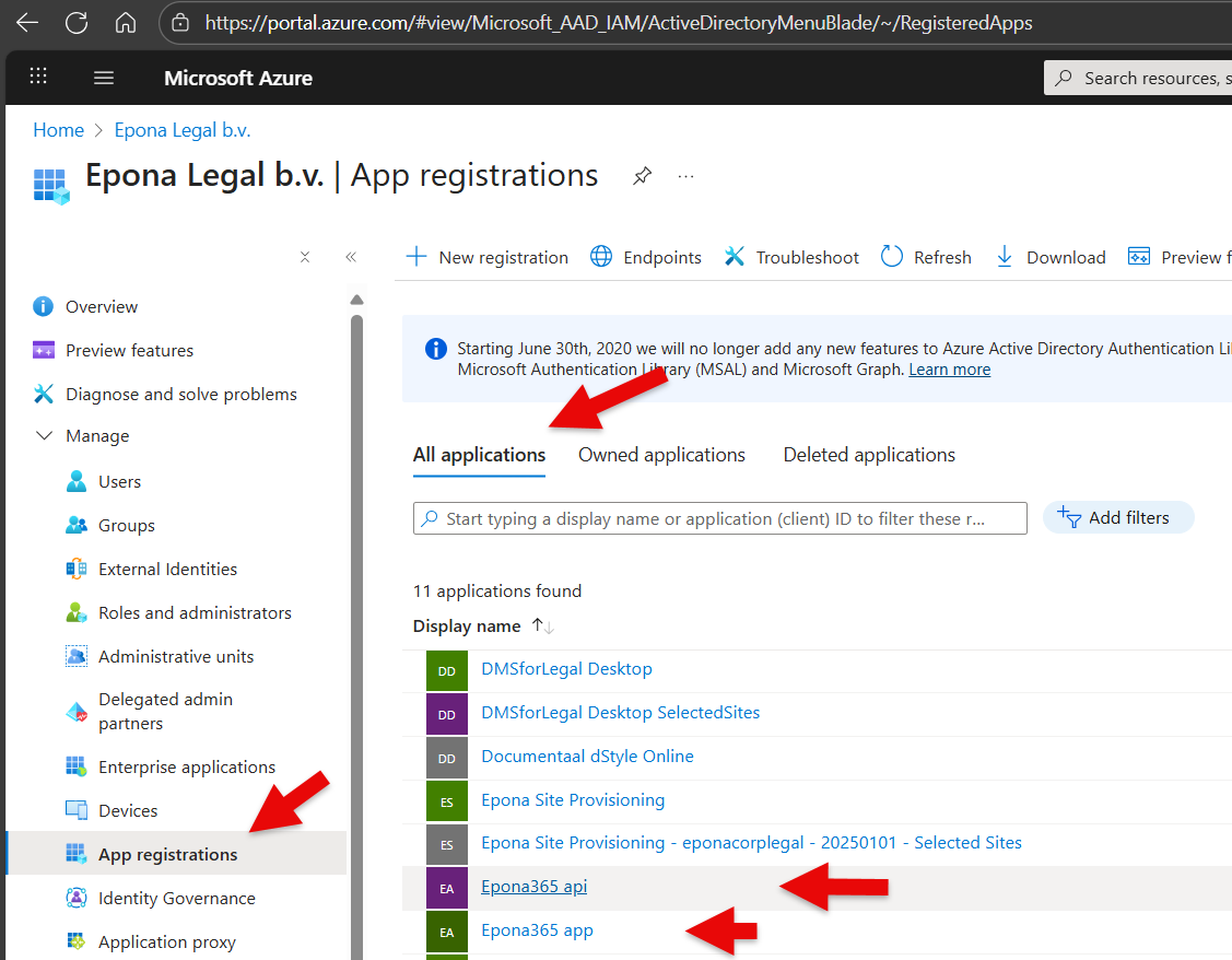 - In the Azure portal, go to Entra ID, select App registrations (not Enterprise applications), filter on All applications