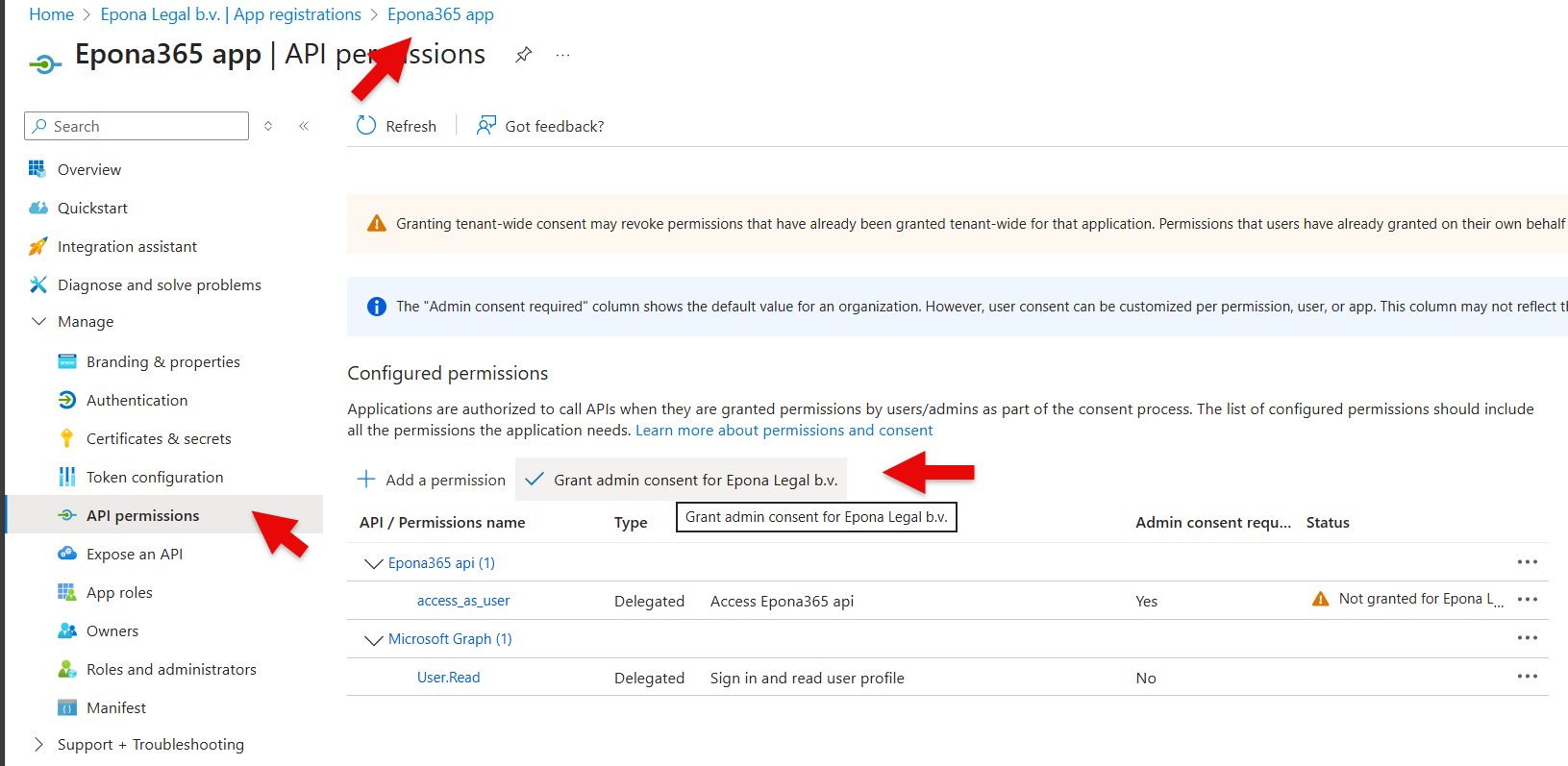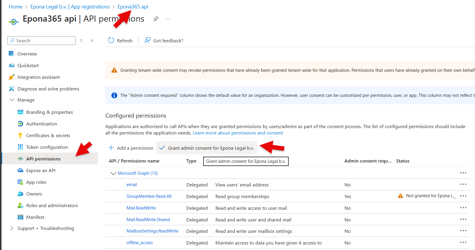 - Click Manage, API permissions and Grant admin consent for {username of the global admin}