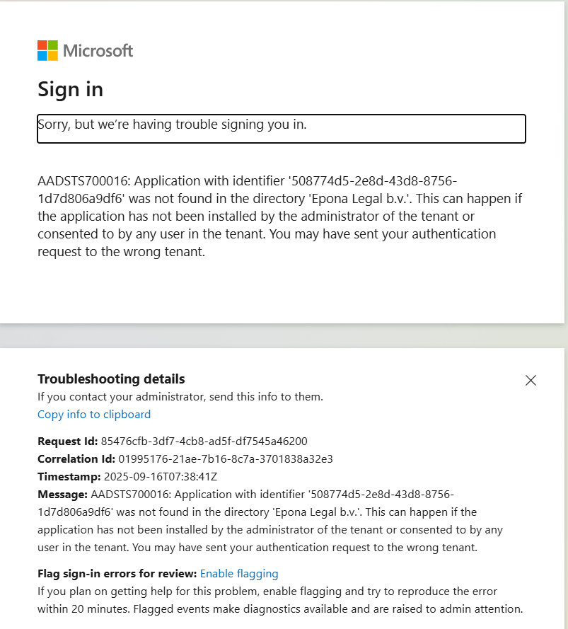 If the Entra ID APPs have not been properly installed or no API permissions are assigned and granted, you will see the error below