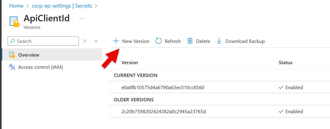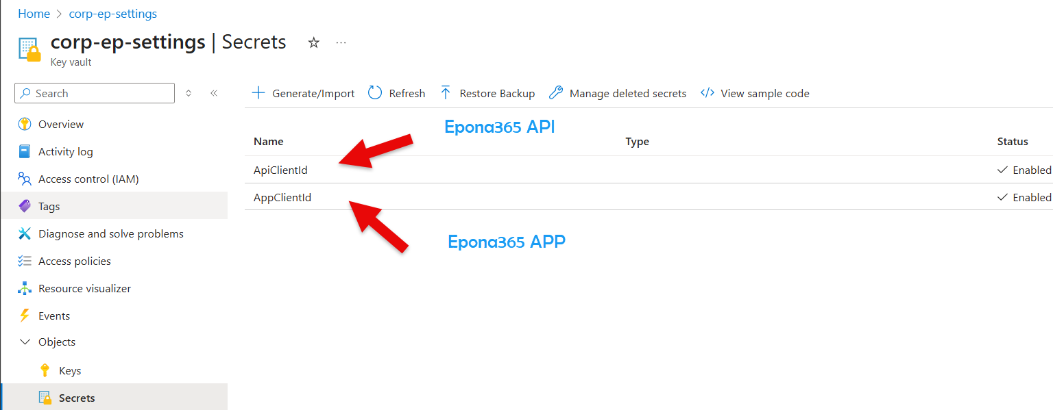- Go to the Epona365Office Resource Group and select the {prefix}-ep-settings Keyvault