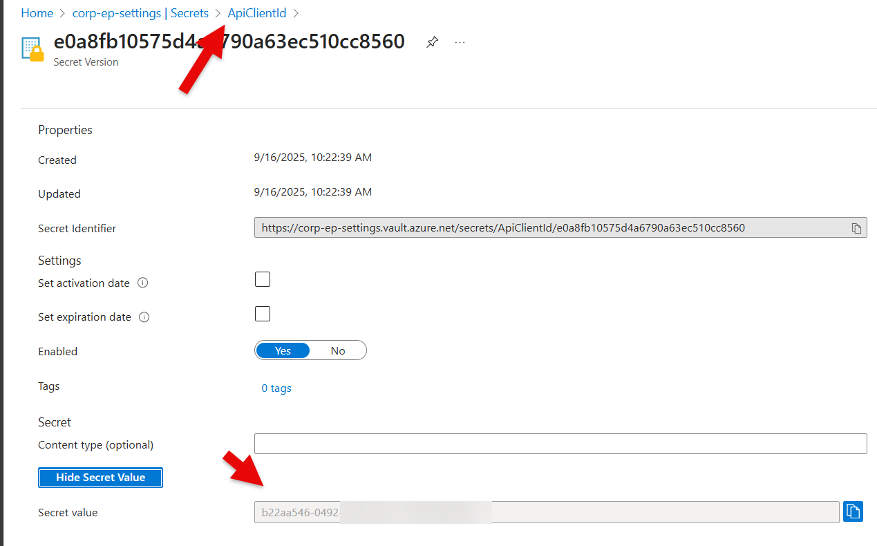 If you unhide the Secret, then you are able to check if the ID in ep-settings alligns with the Application (client) ID in Entra