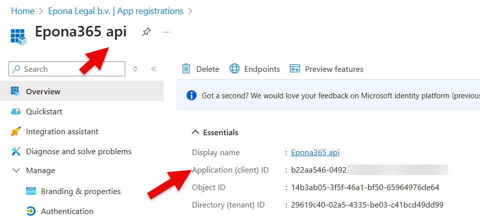 Remark: if you redo a deployment and overwrite the Epona365 API and APP apps in Entra ID, then the {prefix}-ep-settings, Secret value is not alligned with the Application (Client) IDs of the newly created APPs. Visit https://{yourwebcontainerURL}/api/configuration to check the APP and API Application (client) ID that is in use. If you change the Secret, then the web container needs to be restarted. Please also be aware that APP ID's are registered in Manifest files. Update Manifest files if your have replaced the Entra ID apps. The Entra ID APP relationship is registered in the {prefix}-ep-settings container, Secrets section.