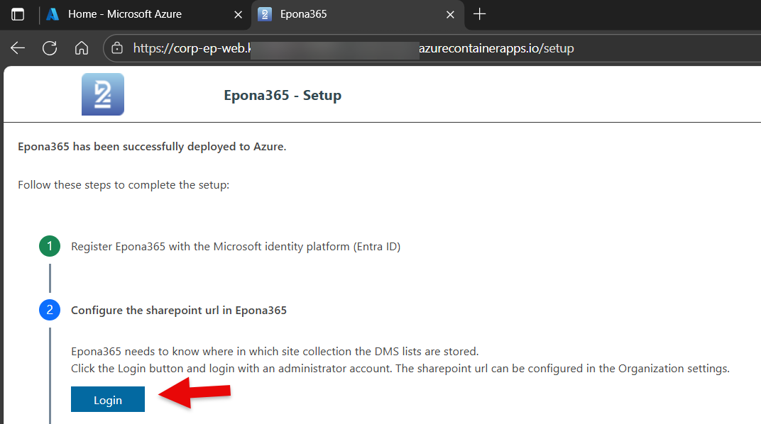- Click on Step 2 in the /Setup page, choose Login to the portal and enter the URL of the Epona site collection that contains the management lists (Matters, etc)