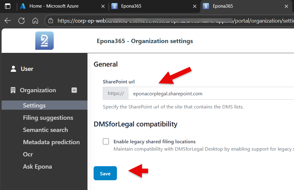 The SharePoint URL where the Epona365 (DMSforLegal) is deployed need to be defined. The /portal settings will be registered in that location. This means that the Global Admin needs access to the location where the Matters, My Matters and other Epona lists reside.