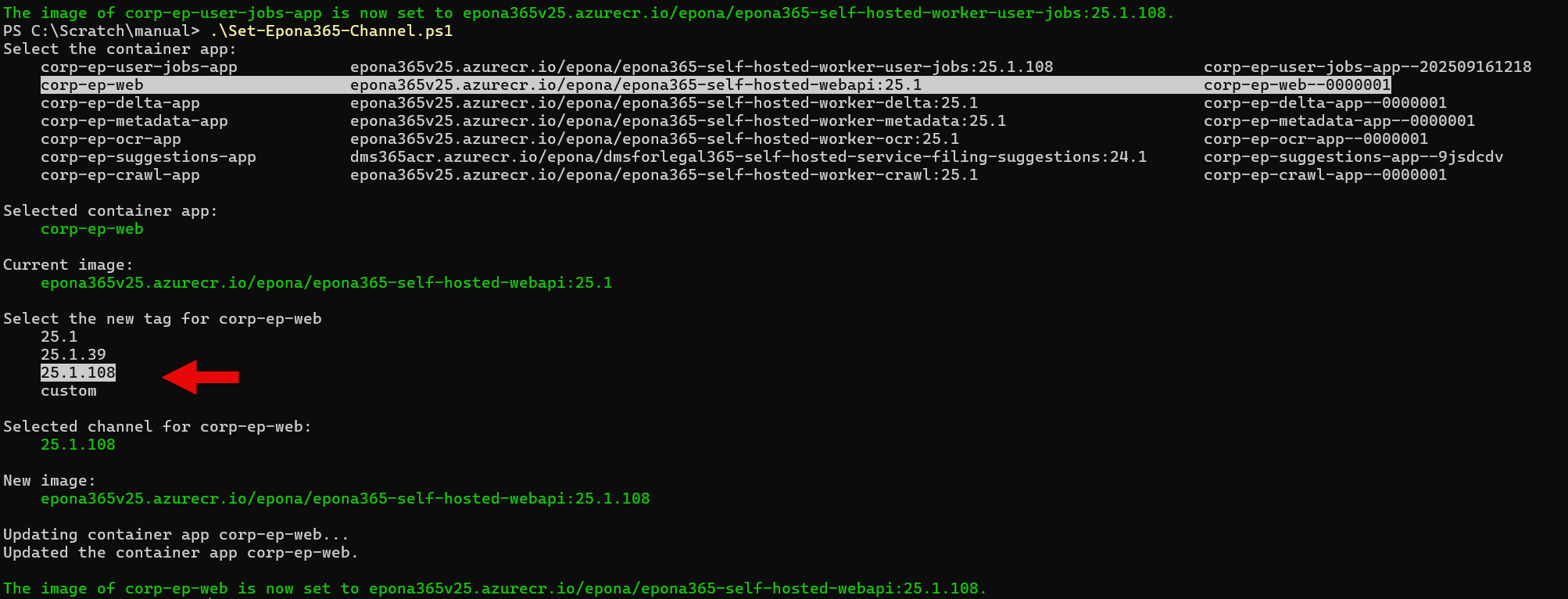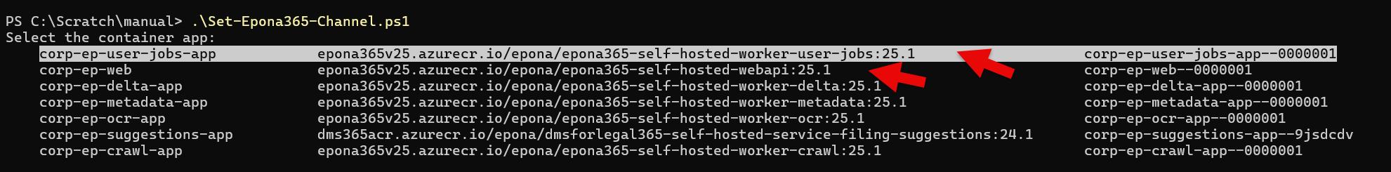 - Use the Set-Epona365-Channel script to set the Epona365 Office environment to 25.1.108 or above.