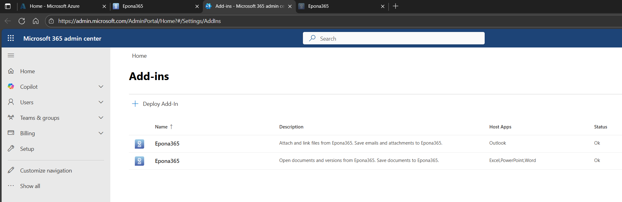 The last steps in the deployment of Epona365 Office involves deploying the Manifest files to Microsoft 365. This is again a task that can only be performed by a Global Administrator or a role that is allowed to deploy apps in Microsoft 365. The Manifest files used by Epona are XML based. There will also be a JSON based manifest file soon that would work for both Outlook and Office, but in this case we deploy two seperate Manifest files, one for Outlook and the other one for Office