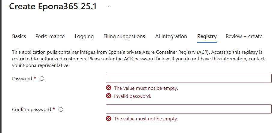 - Click Next and enter the password to retrieve new containers from the Azure Container Registry at Epona. This password will be sent to your when Epona has opened the Azure Marketplace Private plan for your Azure subscription