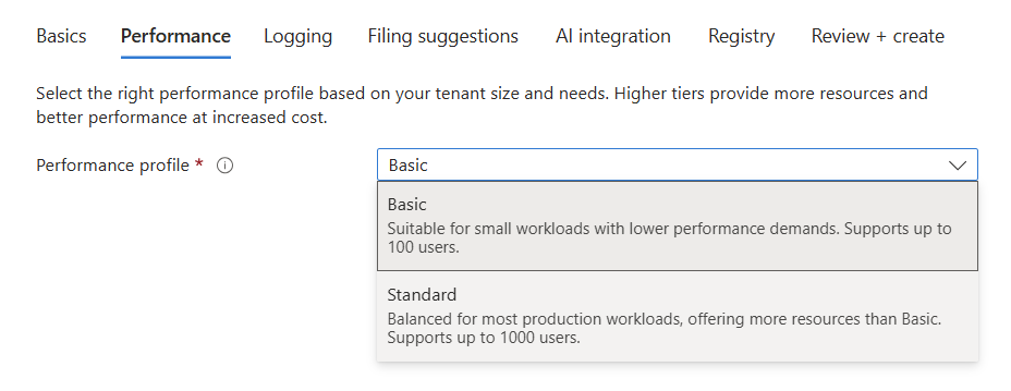 - Click Next and select Basic or Standard performance parameters. Basic is suites for up to 100 users and Standard is suited for 500+ users. Choose Basic for small Proof of Concept deployments.