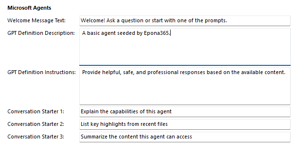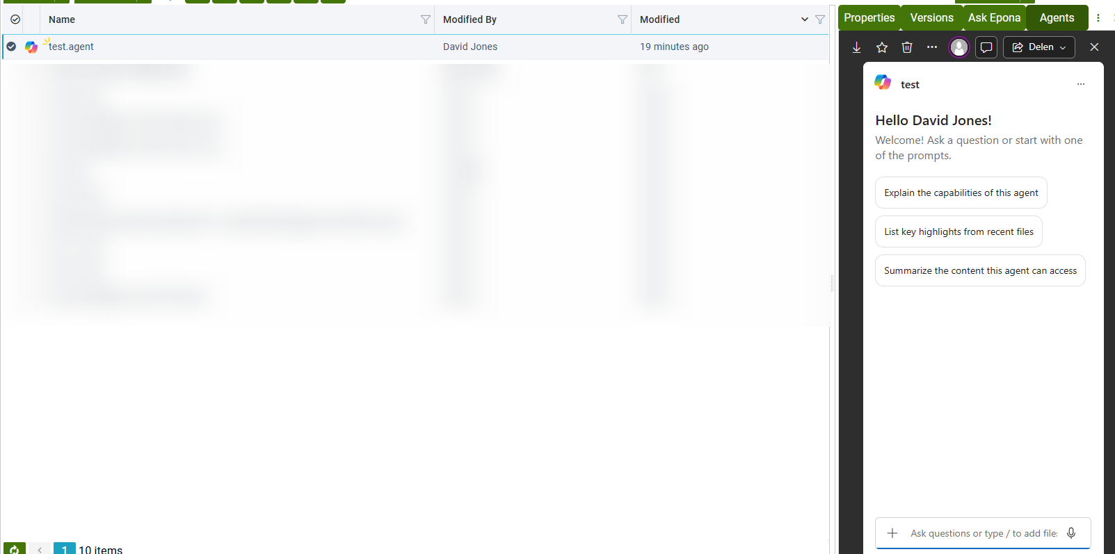 Epona365 WEB can show and create Copilot Agents files, that can be used to ask questions about the data that is stored in SharePoint.