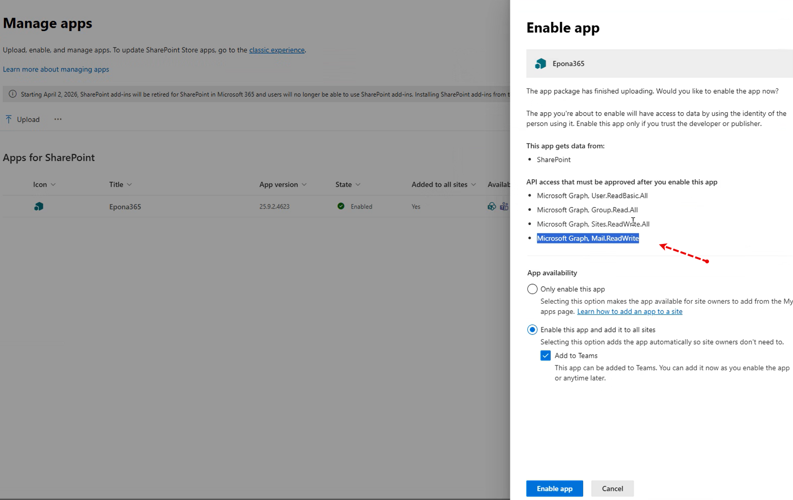 - After replacing the SPPKG file, an additional permission Microsoft Graph, Mail.ReadWrite is added