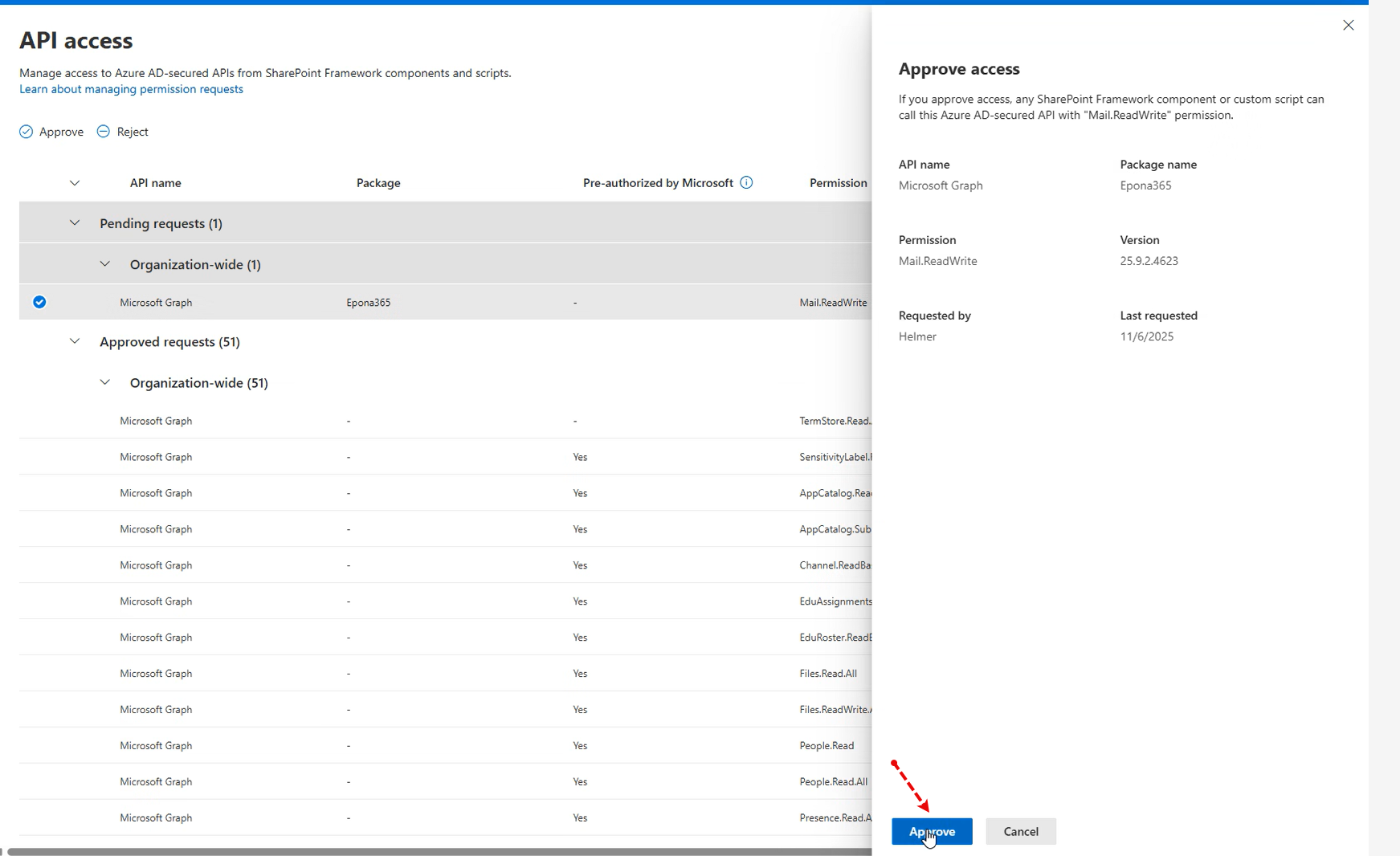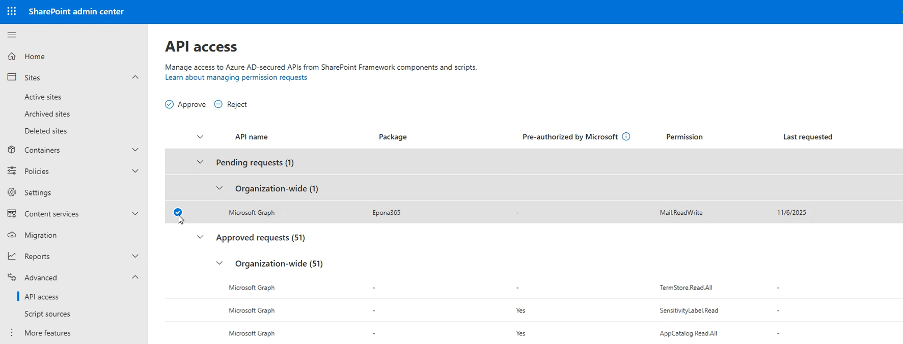 After updating Epona365 WEB, the permission request is visible in the API Access portal. https://{yourtenantname}-admin.sharepoint.com/_layouts/15/online/AdminHome.aspx#/webApiPermissionManagement (opens new window)