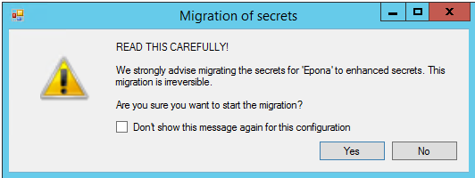 Changing the secrets requires you to run the Configurator under an application account (the account that runs the Site Provisioning service). To do this, you can use the option Shift-RightClick on the Epona.Configurator.exe.